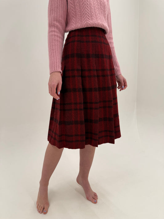 Fustă dark red plisata din Tartan de lana cu talie ultra înaltă midi mai lung
