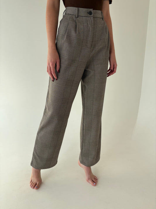 Pantaloni palazzo din stofita în carouri fine și culori neutre cu talie ultra înaltă