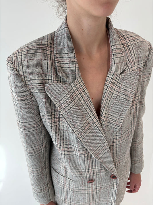 Sacou vintage cu închidere dublă și carouri fine powder pink din lana