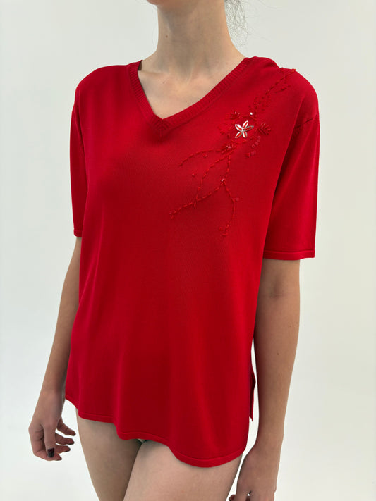 Top vintage cherry red din jerse cu aplicații manuale delicate