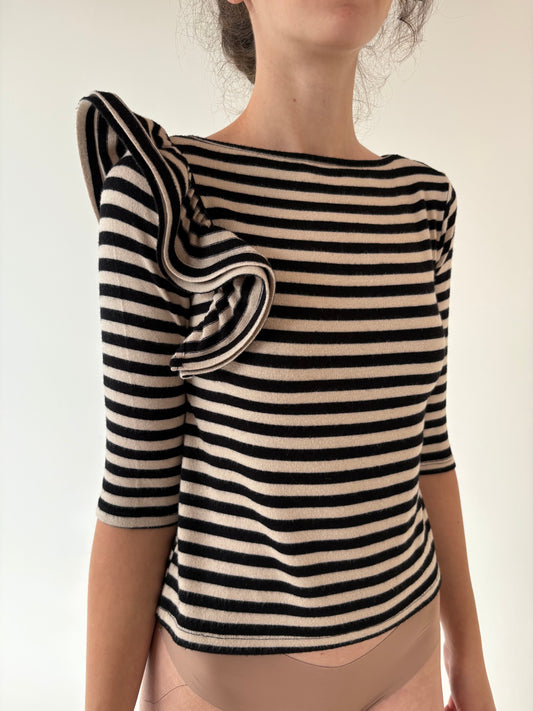 Top din jerse cu volum deosebit pe umăr negru și camel