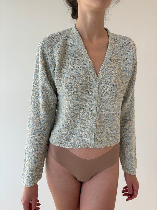Cardigan vintage din jerse texturat baby Blue și camel din bumbac greu