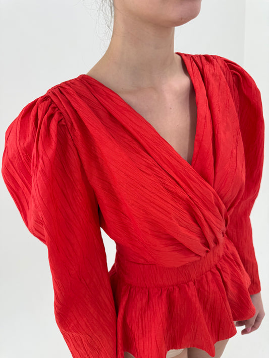 Top vintage cu peplum ultra cambrat și mâneci bufante cherry red