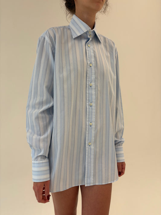Oversized/ L/XLCămașa baby blue în croi actual cu dungi fine verticale taupe