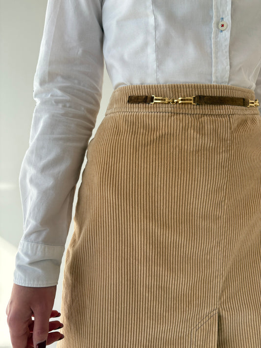 Fustă vintage camel din corduroy în stil Celine cu decorațiune metalică