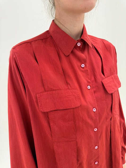 Oversized/ XLCămașa brick red de mătase naturală cu influențe casual