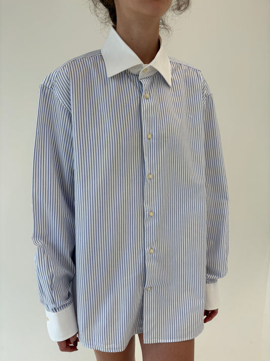 Cămașa în dungi Navy verticale cu manșete și guler contrastante