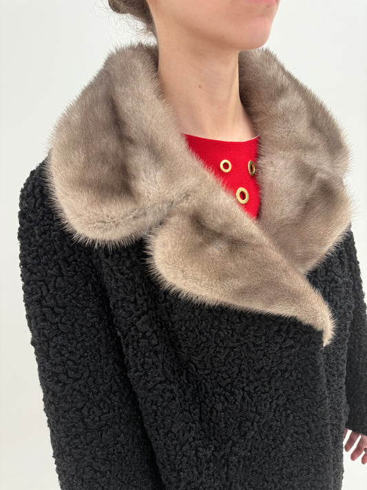 Palton vintage din lână jacquard structurată cu fir reliefat și blană de nurcă albă
