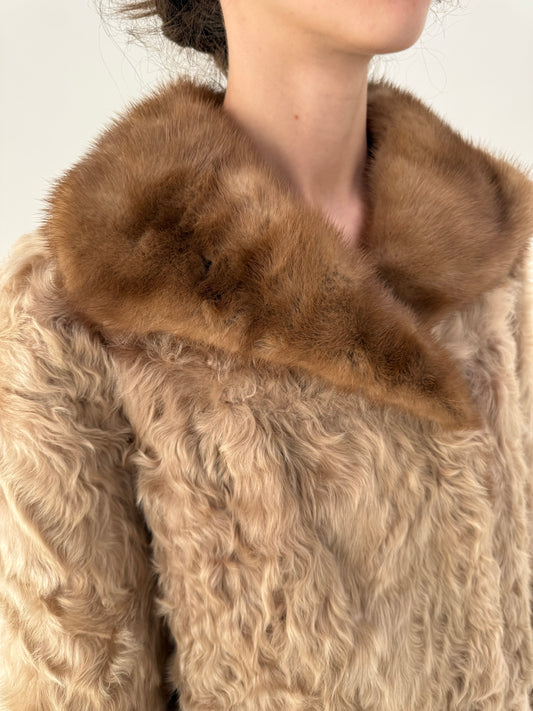 Blană vintage luxury mouton frisé light camel cu guler din blană de nurcă