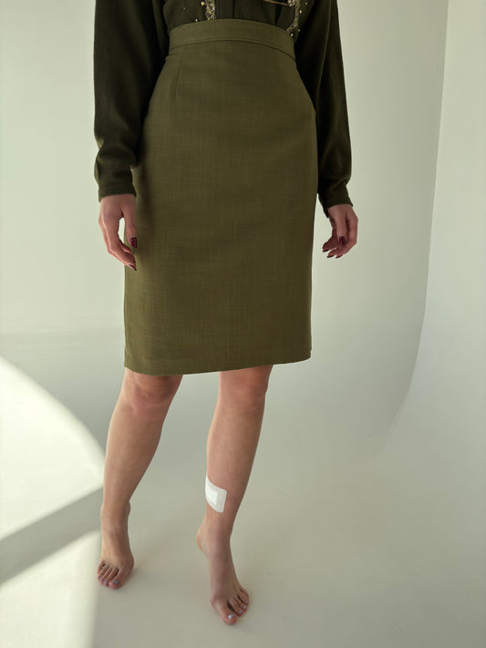 Fustă kaki din mix de lana extrafina conică cu talie ultra înaltă marcată