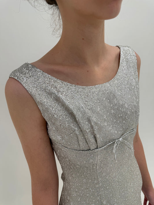 Rochie Old vintage anii 60 in croiala sculpturală și decolteu bateau din jacquard argintiu