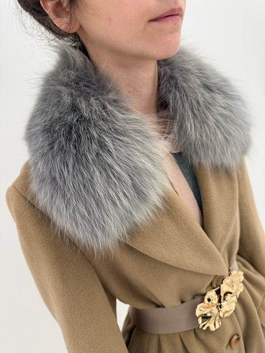Palton camel ușor cambrat din stofă de lana și Angora extrem de fină cu blană naturală