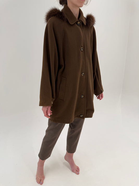Palton italian din lana și cașmir chocolate brown cu glugă și blană naturală