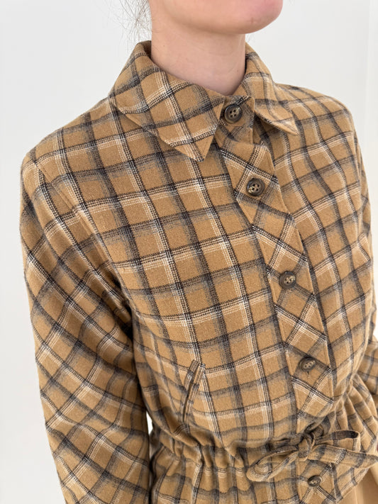Jacheta vintage camel în carouri din lana și cașmir cu talie marcată reglabilă
