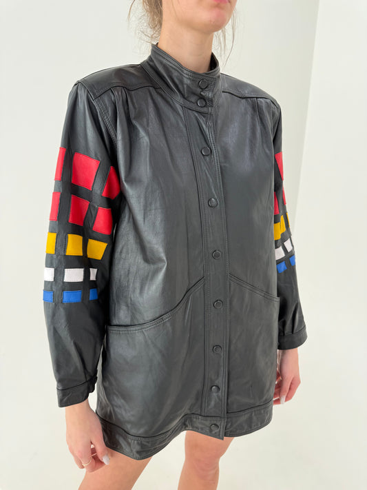 Geacă din piele naturală moale cu inserții colorate și croi oversized