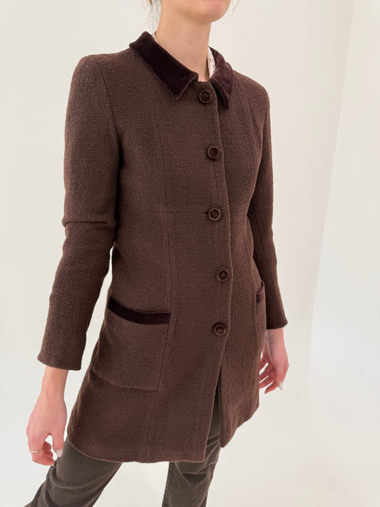 Pardesiu de primăvară în stil chanel chocolate brown cu inserții de catifea