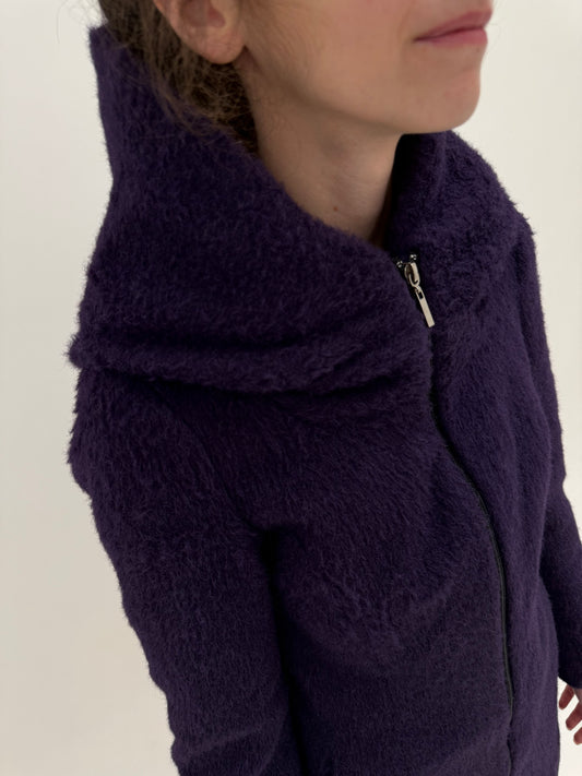 Palton cambrat aubergine din boiled wool cu guler înalt