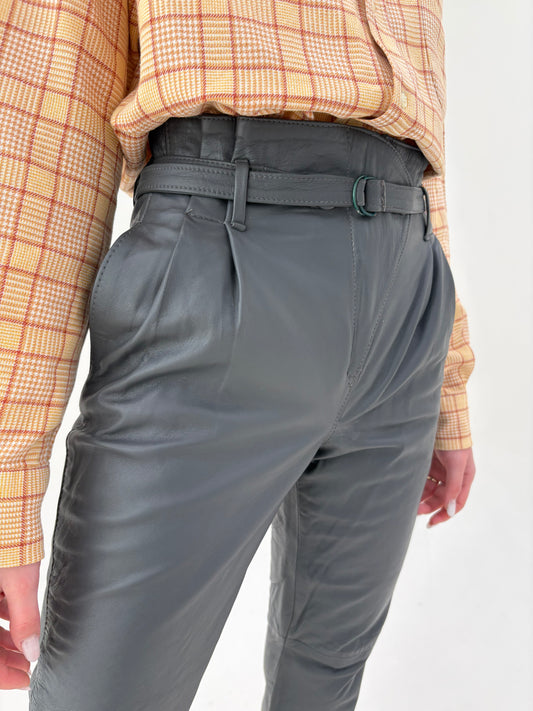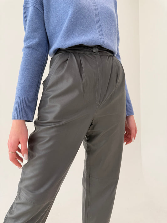 Pantaloni din piele naturală steel gray cu talie extrem de înaltă și pense