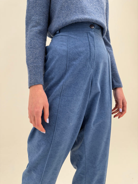 Pantaloni cu talie înaltă și aspect de piele întoarsă albastru ciel