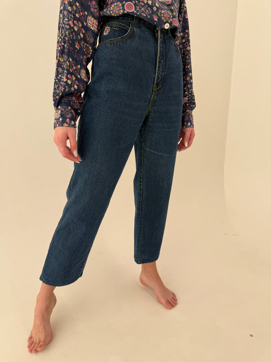 Jeans vintage premium dark wash straight leg mom fit cu talie ultra înaltă