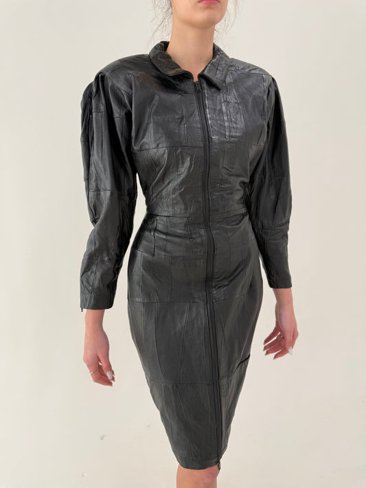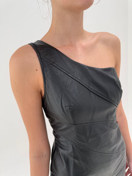 Rochie cambrata din piele naturală în croi asimetric cu talie marcată