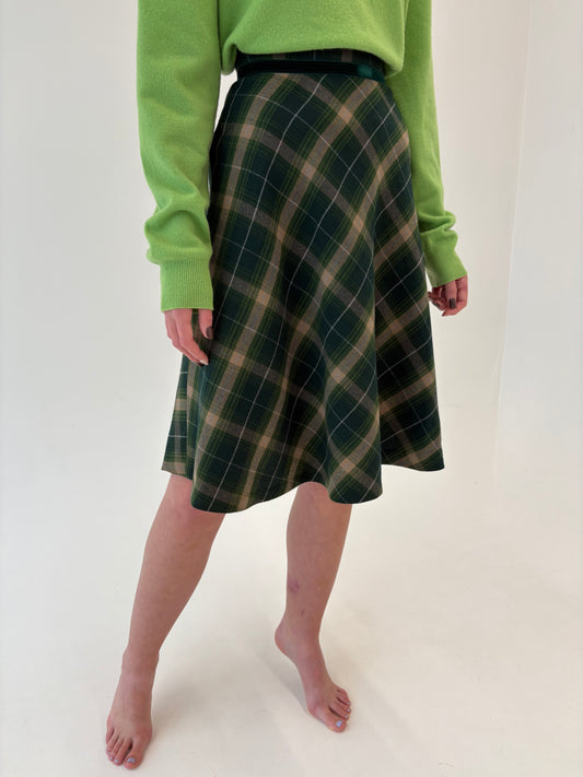 Fustă vintage din Tartan de lana green forest în carouri camel