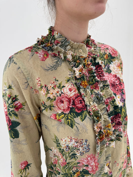 Cămașa Sage green cu print floral superb și mini jabou din bumbac fin