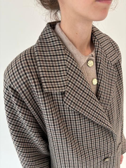 Pardesiu scurt vintage light nude în carouri din lana extrafina în croi retro modern