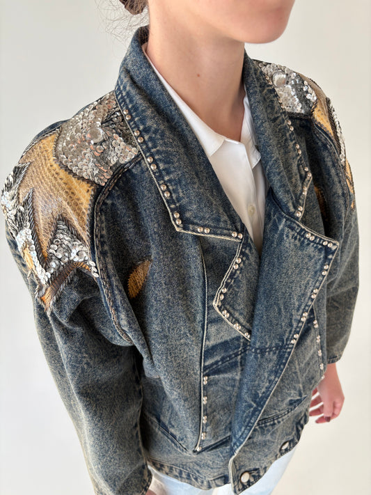 Geacă vinatge luxury din jeans cu piele de șarpe și aplicații manuale