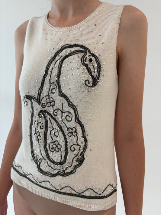 Top butter white din lana merino extrafina cu aplicații manuale delicate