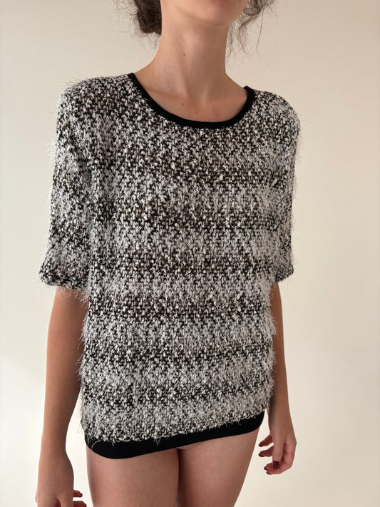 Top din jerse pufos in stil Chanel cu franjuri fine și inserții delicate aurii