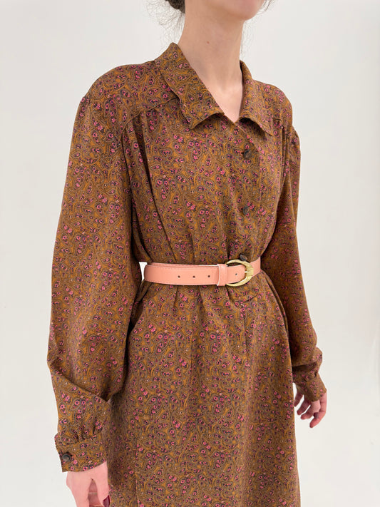 Robe chemise vintage din lana extrafina caramel brown cu print roz delicat