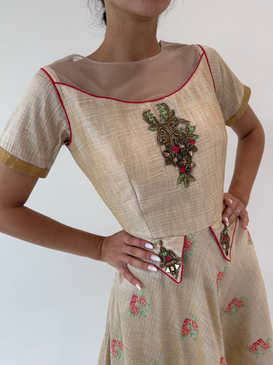 Rochie vintage cafe au lait cu broderie din pânză brodată de mătase naturală