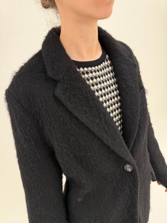Sacou negru gros cu închidere tip smoking din lana cu aspect de blăniță