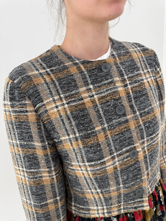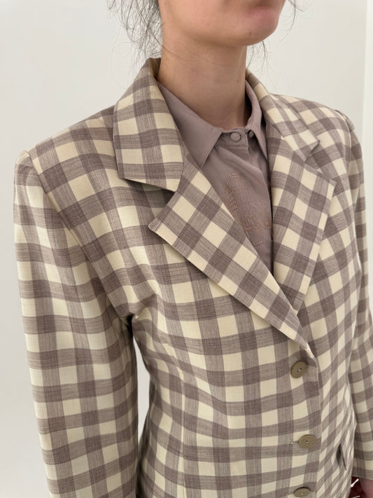 Sacou în croi scurt minimalist și carouri in culori neutre cu camel