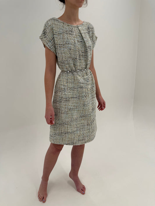 Rochie baby blue în stil Chanel din tweed prețios în croi lejer