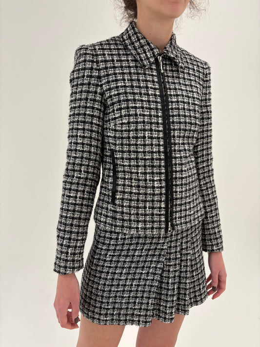 Deux piece in stil Chanel din tweed de lana alb negru cu fusta mini plisată