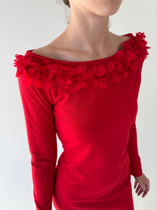 Rochie roșu tare cu decolteu bărcuță și aplicații