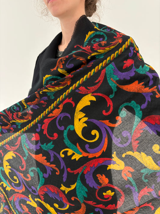 Eșarfă XXXL neagră cu print în culori tari din lana extrafina