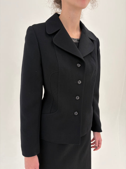 Deux piece vintage negru cu sacou cambrat și revere rotunjite din lana certificată