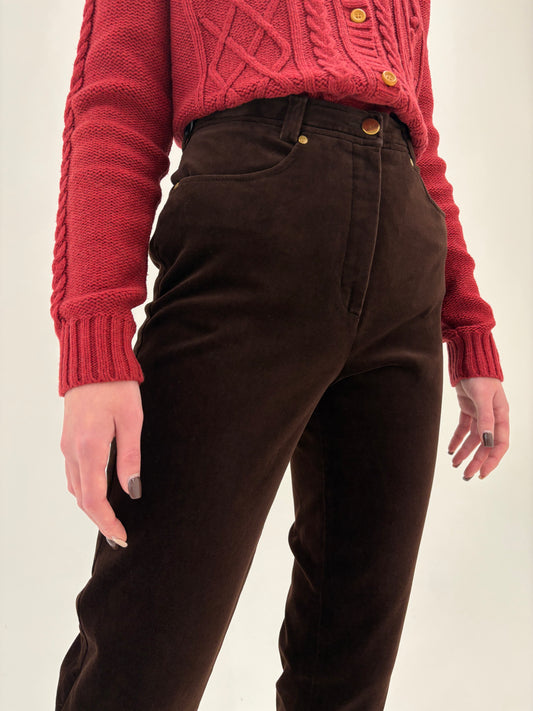 Pantaloni confort chocolate brown din catifea modelatoare cu talie înaltă