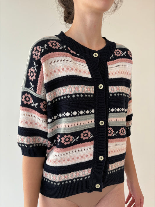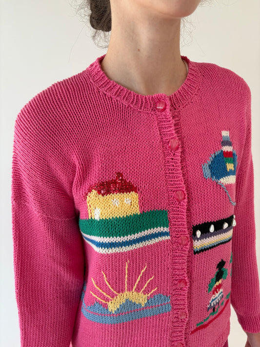 Cardigan vintage Barbie pink lucrat manual din bumbac de gramaj mare