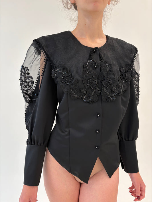 Cămașa neagră bijuterie cu aplicații manuale și inserții de organza