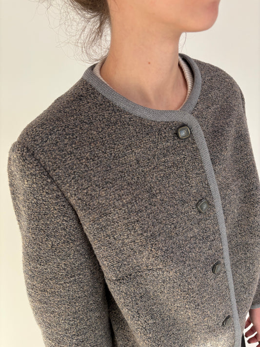 Jacheta petite in stil Chanel din boucle de lana warm gray cu baby blue