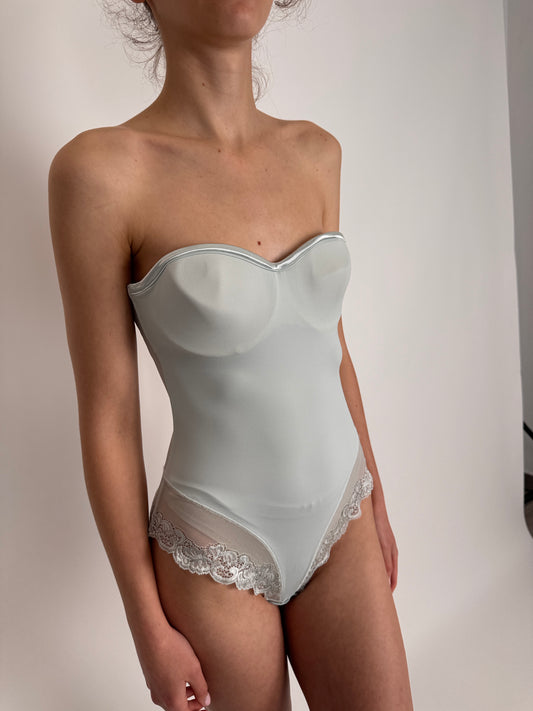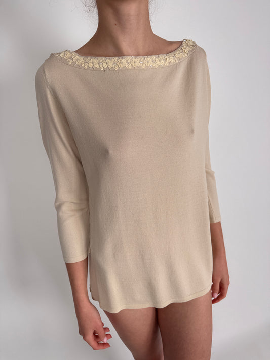 Bluză nude cu aplicații delicate și decolteu bărcuța