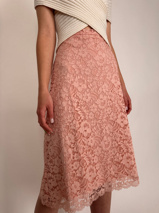 Fustă roz pudrat din dantelă plină grea cu talie ultra înaltă