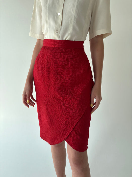 Fustă tulip din mătase naturală cherry red texturată