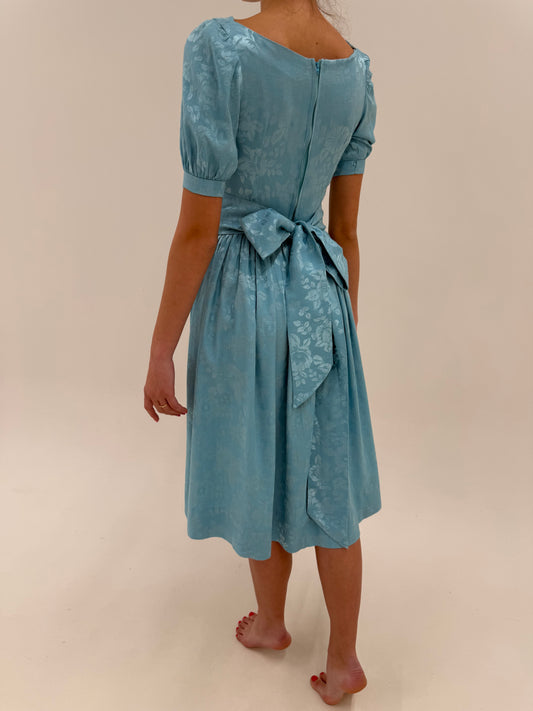 Rochie vintage baby blue din jacquard în croi de ani 50 cu talie ultra înaltă marcată