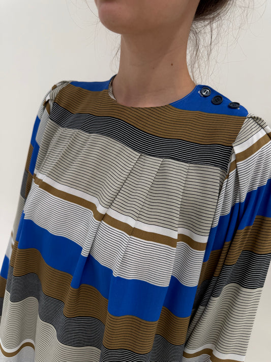 Cămașa din mătase naturală cu mâneci ample și croi drapat în dungi