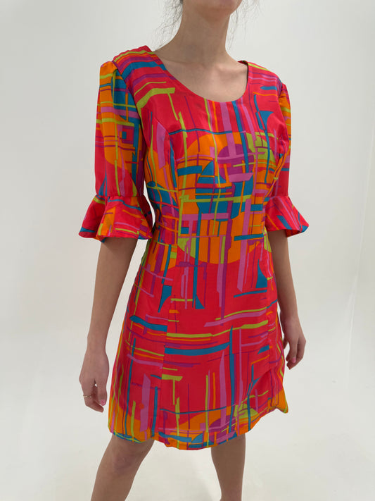 Rochie vintage în culori tari și croi ușor cambrat cu print geometric